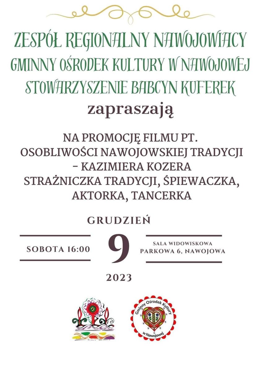 W najbliższą sobotę 9 grudnia zapraszamy na premierę filmu pt. Osobliwości Nawojowskiej Tradycji – Kazimiera Kozera – strażniczka tradycji śpiewaczka, aktorka tancerka