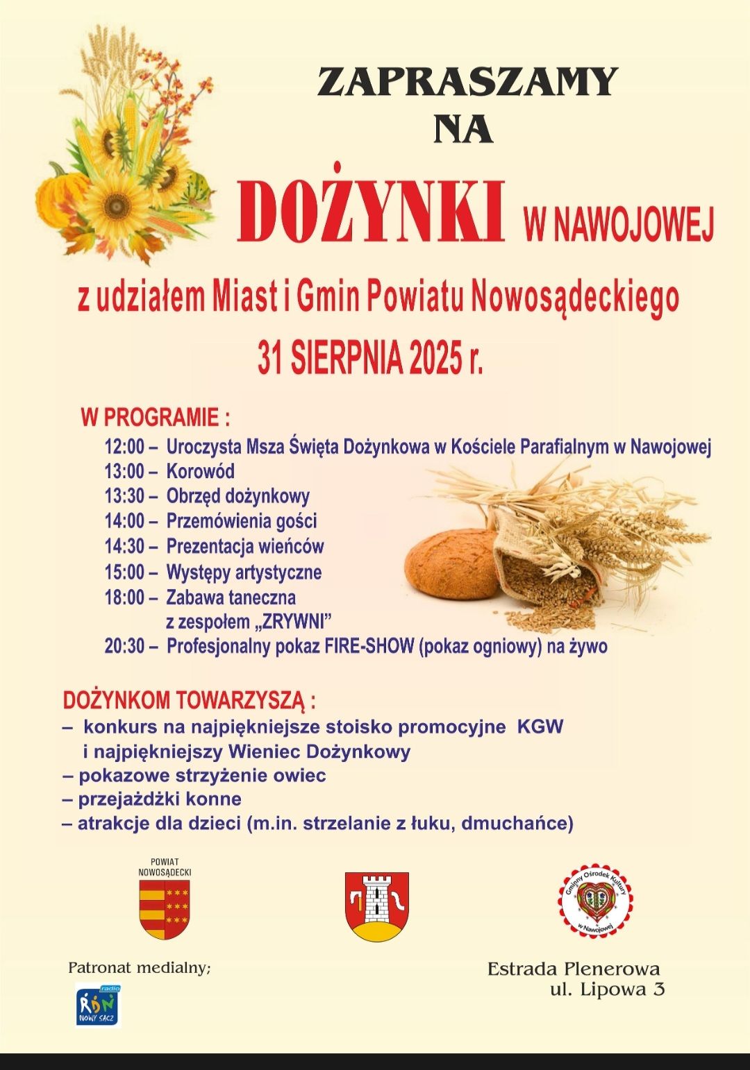 Serdecznie zapraszamy w niedzielę 31 sierpnia do Nawojowej na dożynki Gminne z udziałem Miast i Gmin Powiatu Nowosądeckiego. Szczegóły poniżej…