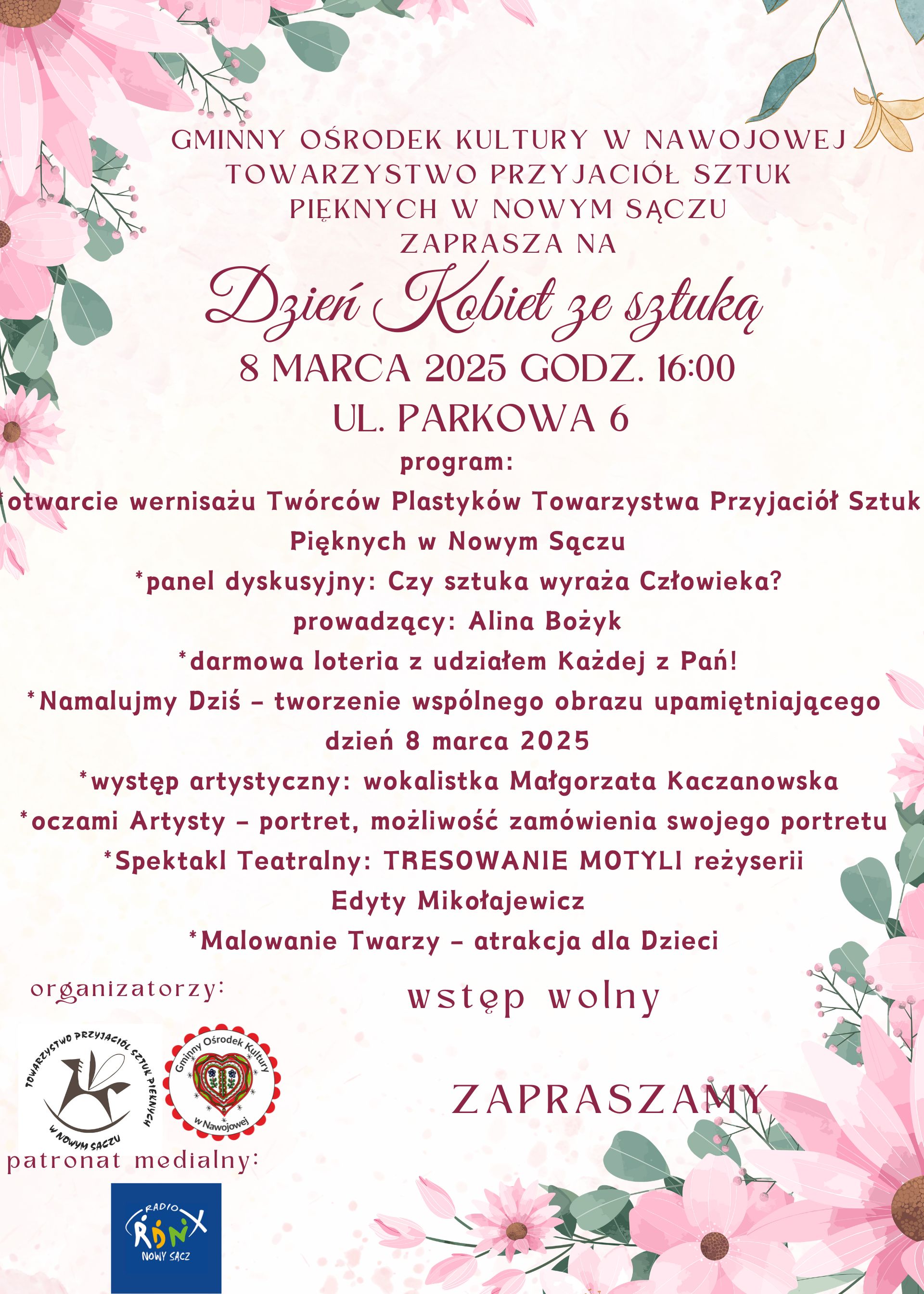 Gminny Ośrodek Kultury w Nawojowej serdecznie zaprasza wszystkie Panie (i Panów) na Dzień Kobiet ze sztuką! Szczegóły poniżej