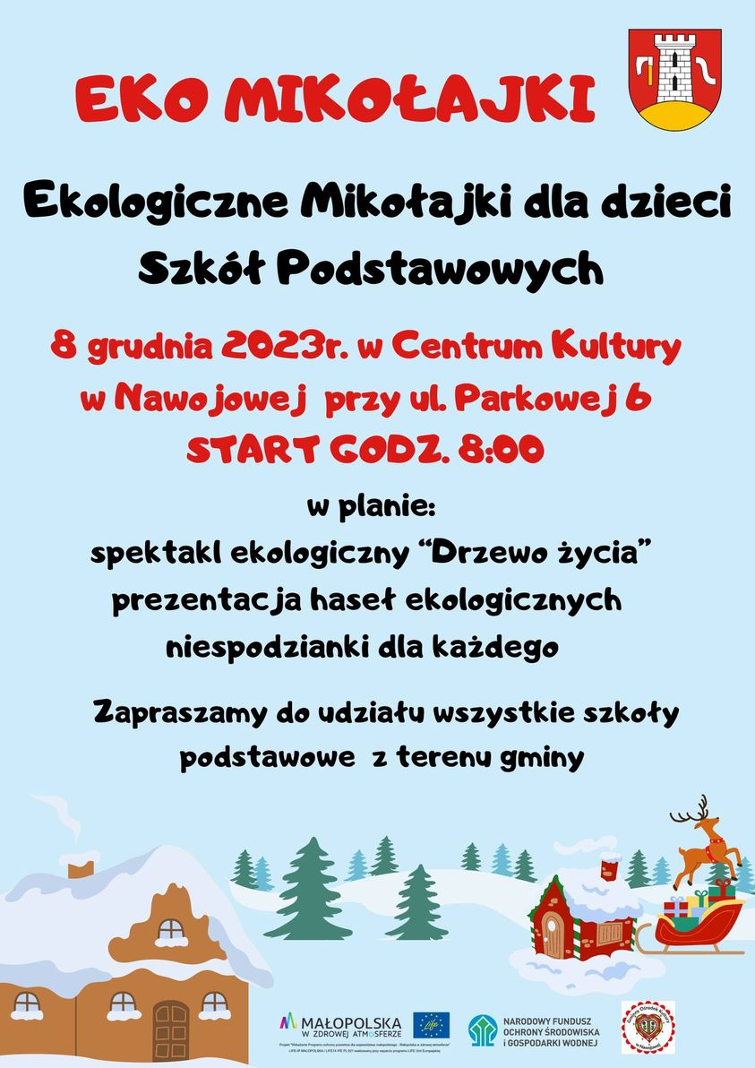 W najbliższy piątek w Gminie Nawojowa odbędą się EKOLOGICZNE MIKOŁAJKI . W programie temat przewodni: EKOLOGIA -szczegóły na plakacie. Wydarzenie w ramach zintegrowanego projektu LIFE, organizowane przez Urząd Gminy Nawojowa przy współpracy z Gminnym Ośrodkiem Kultury w Nawojowej