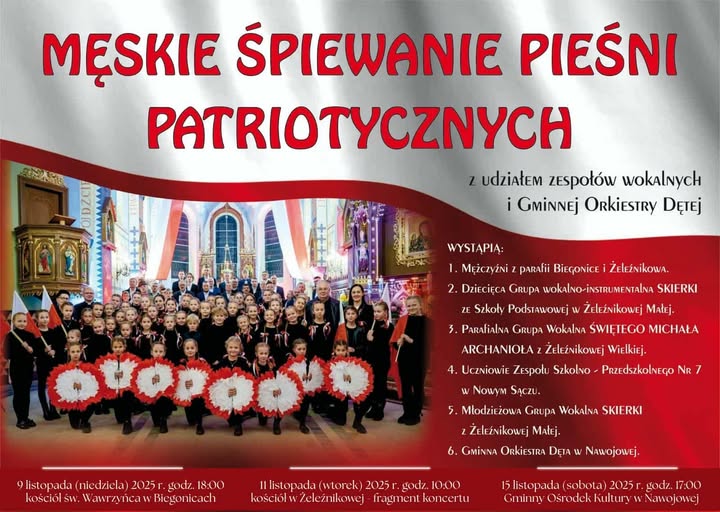 W najbliższą sobotę 15 listopada zapraszamy na koncert pieśni patriotycznych pn. „Męskie Śpiewanie Pieśni Patriotycznych” w którym wystąpią: