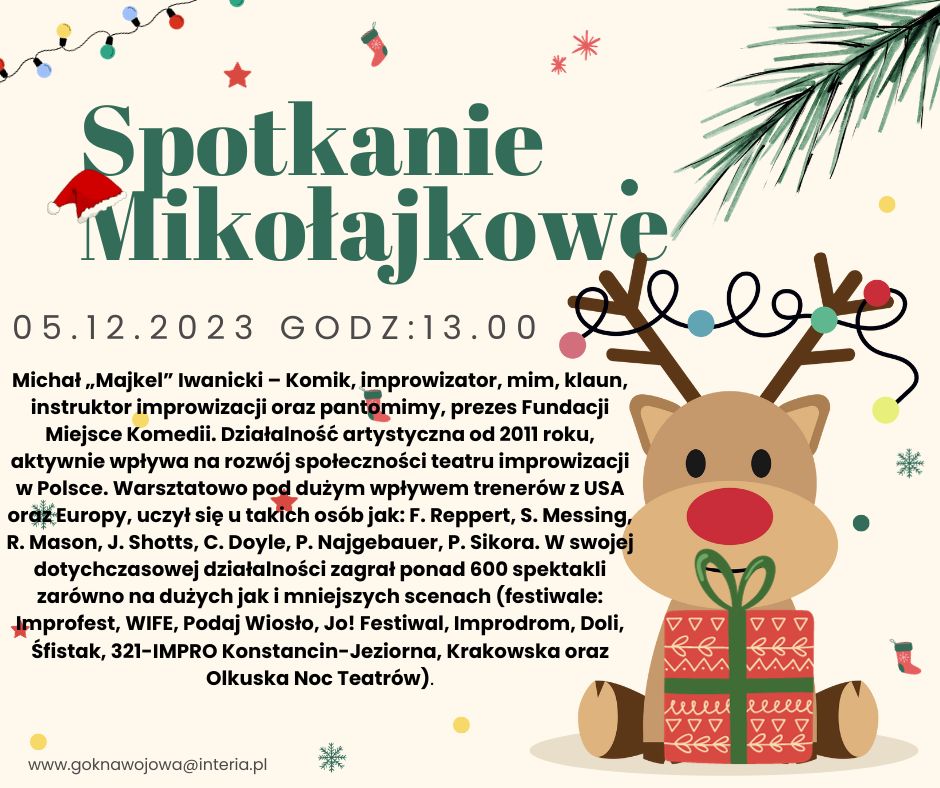Zapraszamy Dzieci i Młodzież wraz z Rodzicami, Wychowawcami na spotkanie Mikołajkowe dn.05.12.2023r godz. 13:00! W planie wydarzenia m. in. profesjonalne warsztaty improwizacji scenicznej prowadzone przez Pana Michała Iwanieckiego. Sala widowiskowa Gminnego Ośrodka Kultury ul. Parkowa 6.