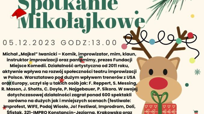 Zapraszamy Dzieci i Młodzież wraz z Rodzicami, Wychowawcami na spotkanie Mikołajkowe dn.05.12.2023r godz. 13:00! W planie wydarzenia m. in. profesjonalne warsztaty improwizacji scenicznej prowadzone przez Pana Michała Iwanieckiego. Sala widowiskowa Gminnego Ośrodka Kultury ul. Parkowa 6.
