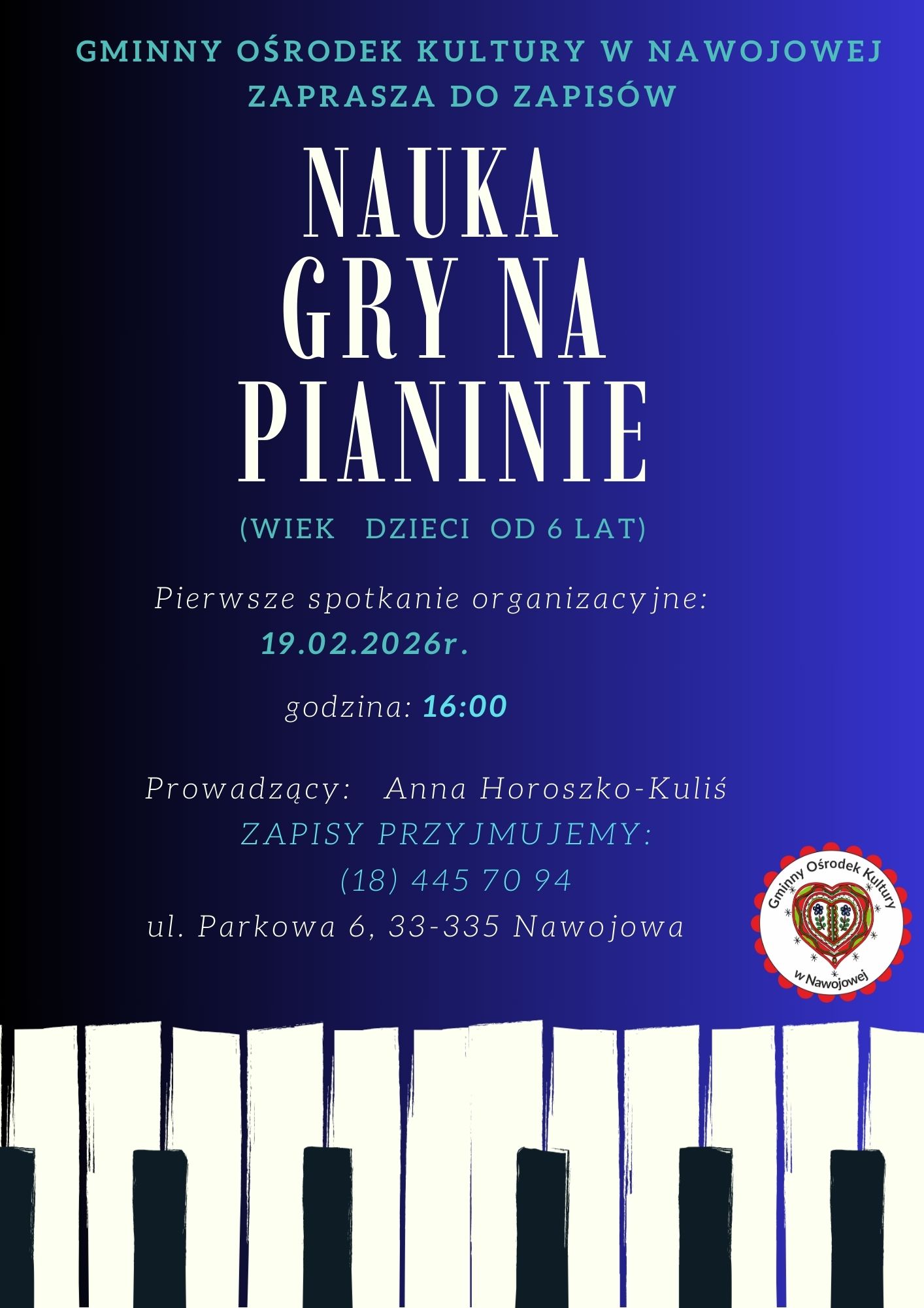 Gminny Ośrodek Kultury zaprasza na zajęcia z nauki gry na pianinie. Prowadzącą zajęcia będzie pani Anna Horoszko-Kuliś. Bliższe informacje pod nr telefonu 18 4457094 lub mailowo: kontakt@goknawojowa.pl