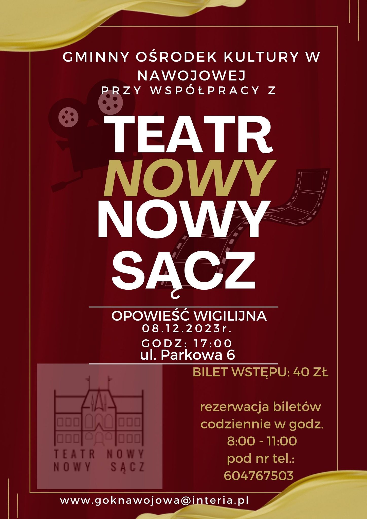 Zapraszamy na sztukę teatralną „Opowieść Wigilijna” 08 grudnia br. o godzinie 17:00 w wykonaniu aktorów Teatru Nowego z Nowego Sącza. Bilet w cenie 40 zł do nabycia w kasie GOK w dniu spektaklu. Istnieje możliwość rezerwacji telefonicznej codziennie w godzinach 8:00-11:00 pod nr telefonu 604767503.