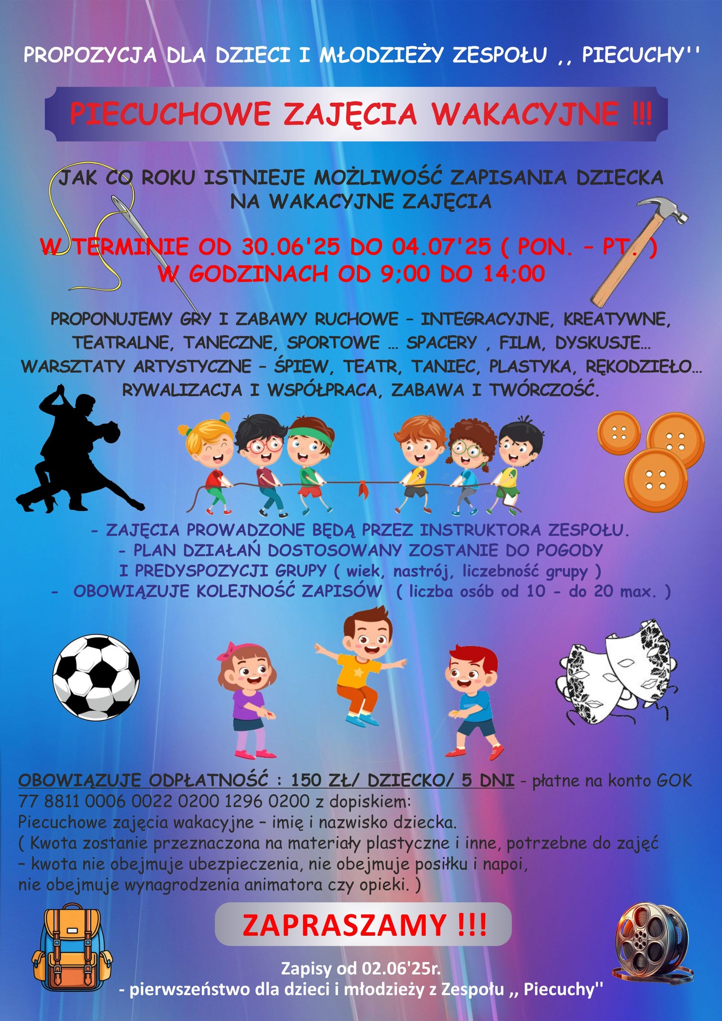 Przedstawiamy pierwszą propozycje wakacyjną – Piecuchowe Zajęcia Wakacyjne . Pierwszeństwo uczestnictwa w zajęciach mają Dziecięco-Młodzieżowy Zespół Folklorystyczny „Piecuchy”. – Piecuchy.