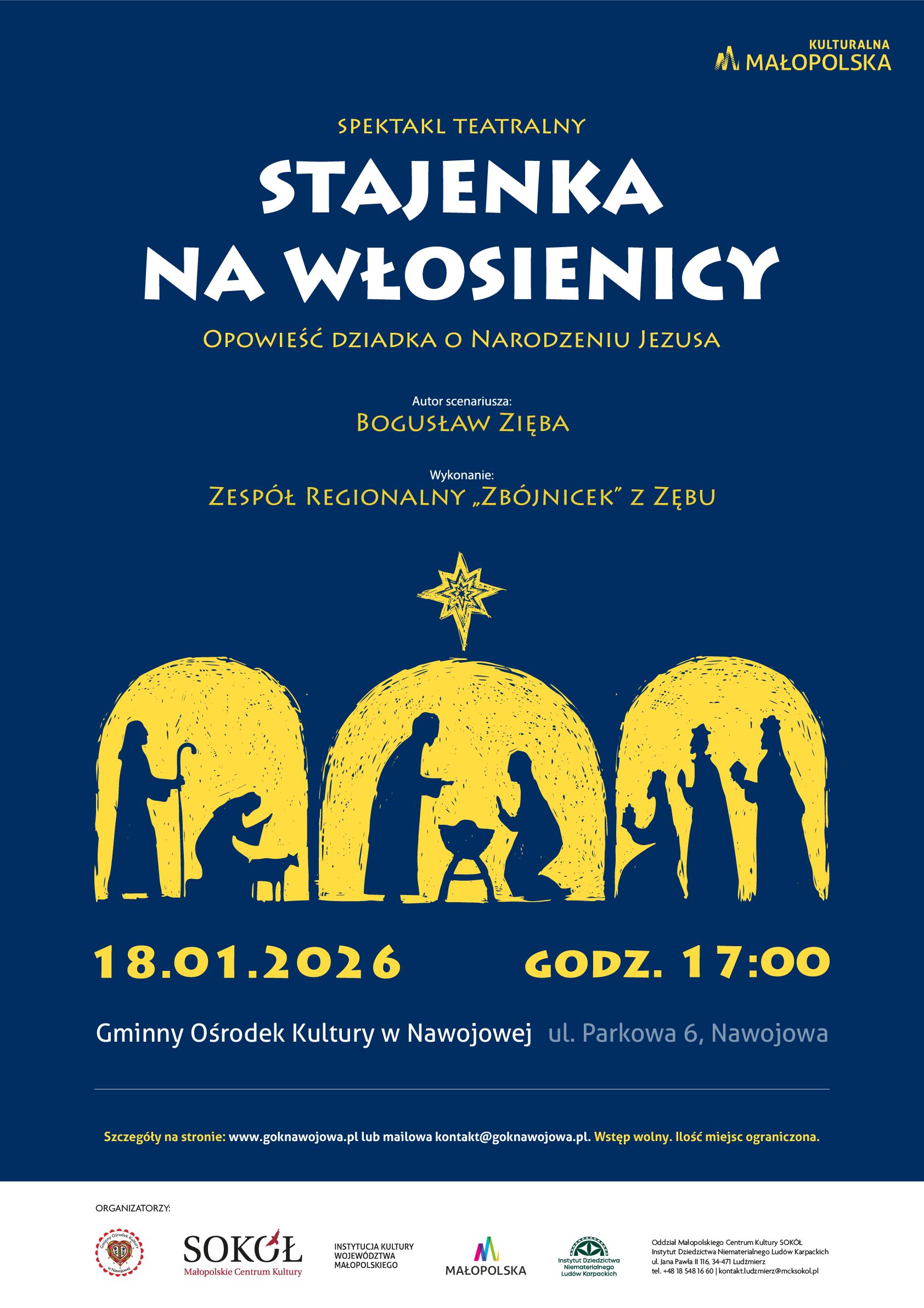 Małopolskie Centrum Kultury SOKÓŁ, Gminny Ośrodek Kultury w Nawojowej oraz Zespół Regionalny Zbójnicek serdecznie zapraszają na spektakl zatytułowany „Stajenka na Włosienicy. Opowieść dziadka o narodzeniu Jezusa”. Wydarzenie odbędzie się 18 stycznia 2026 roku o godz. 17:00 .