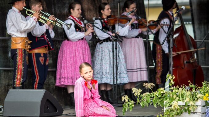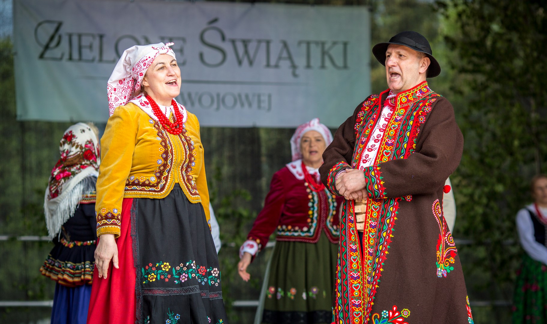 ,,Ludność wiejska łączyła Zielone Świątki z różnymi świętami pasterskimi i rolniczymi, a niektóre z tych zwyczajów przetrwały do dzisiaj. Obyczaje były różne w zależności od regionu. W całej Polsce powszechny był obyczaj majenia domów, płotów i bram. Gospodarstwo maiło się zazwyczaj brzozowymi gałązkami, a na podwórkach i na podłogach w chatach układano grubą warstwę tataraku. Roślinna warstwa miała nie tylko służyć za wiosenną dekorację, ale również chroniła dom przed insektami. Majenie domów i obejść to tradycja licząca sobie przynajmniej kilka wieków. Rolnicy wierzyli, że młoda zieleń i świeże soki roślinne zapewnią powodzenie całemu gospodarstwu i spowodują obfite plony. Majenie obejść miało też zapobiegać zarazie, chorobom, złym czarom, urokom i wszelkim złem, jakie mogło spaść na dom i jego mieszkańców. Od tego zwyczaju majenia domów i zielonych gałązek wzięła się ludowa nazwa tego święta – ZIELONE ŚWIĄTKI. Także dziś kontynuowaliśmy te tradycję i jak Państwo dostrzegli, scenę zdobiły właśnie gałązki brzozowe, będące symbolem Zielonych Świątek.”